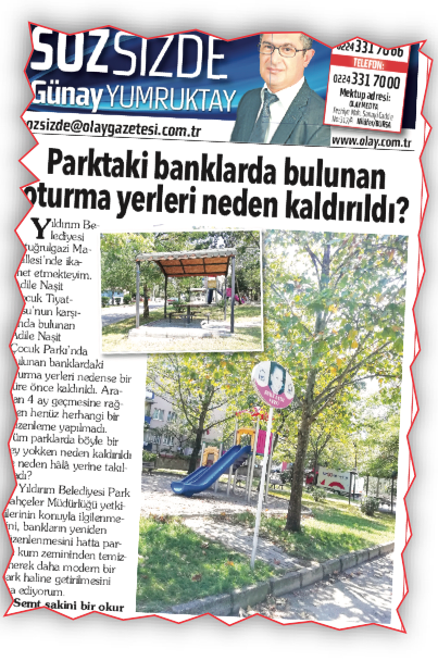 Naşit Çocuk Parkı’ndaki oturma bankları ile ilgili okurun şikâyeti incelenmiştir.