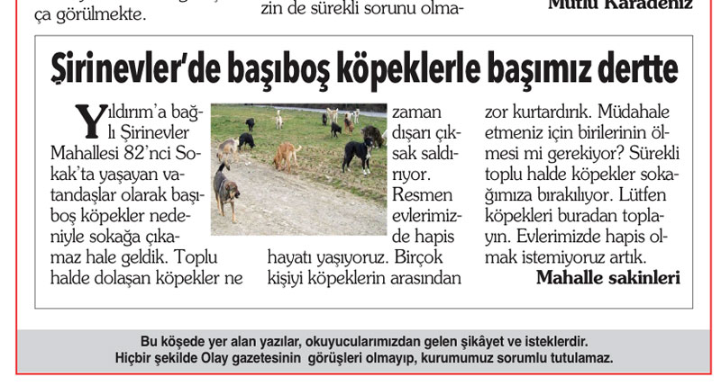 16 Nisan 2021 tarihli Olay gazetesi Söz Sizde köşesinde yayımlanan “Şirinevler’de Başıboş Köpeklerle Başımız Dertte” başlıklı, Şirinevler Mahallesi 82. Sokak’ta ikamet eden vatandaşların başıboş köpeklerin saldırısına uğradığını ve saldırgan köpeklerin toplatılması gerektiğini ifade eden okurun şikâyeti incelenmiştir.