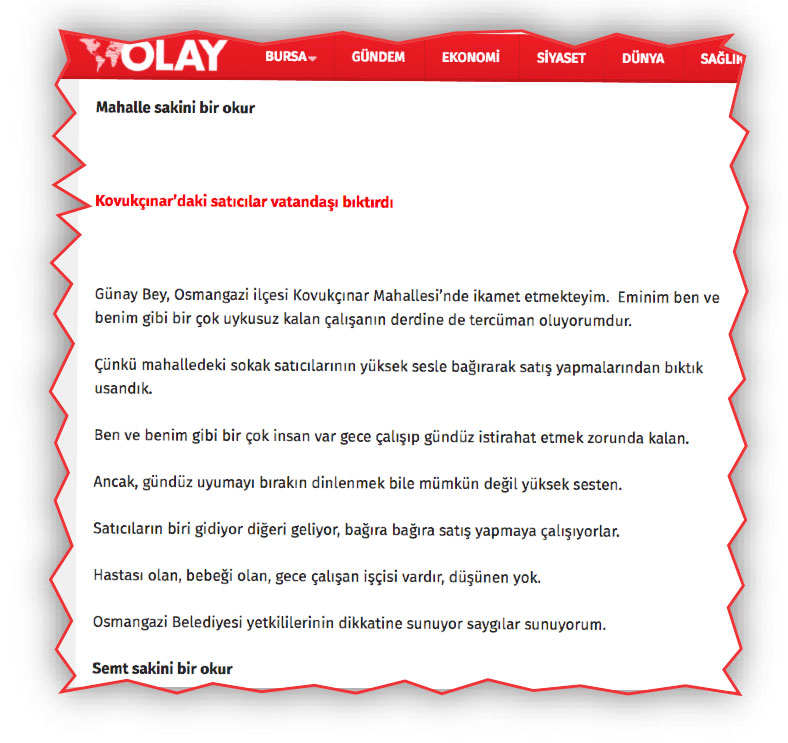 Sayın Günay Yumruktay, Olay gazetesinin 23 Ağustos 2020 tarihli Söz Sizde köşesinde ‘Koğukçınar’daki Satıcılar Vatandaşı Bıktırdı’ başlıklı bir şikâyete yer verilmiştir.