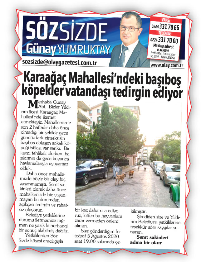 9 Ağustos 2020 tarihli gazetenizin Söz Sizde köşesinde yayımlanan “Karaağaç Mahallesi’ndeki Başıboş Köpekler Vatandaşı Tedirgin Ediyor” başlıklı okur şikâyeti incelenmiştir.