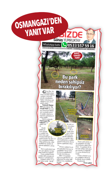 Sayın Günay Yumruktay, Olay gazetesinin 8 Aralık 2022 tarihli Söz Sizde köşesinde ‘Bu Park Neden Sahipsiz Bırakılıyor?’ başlıklı bir şikâyete yer verilmiştir.