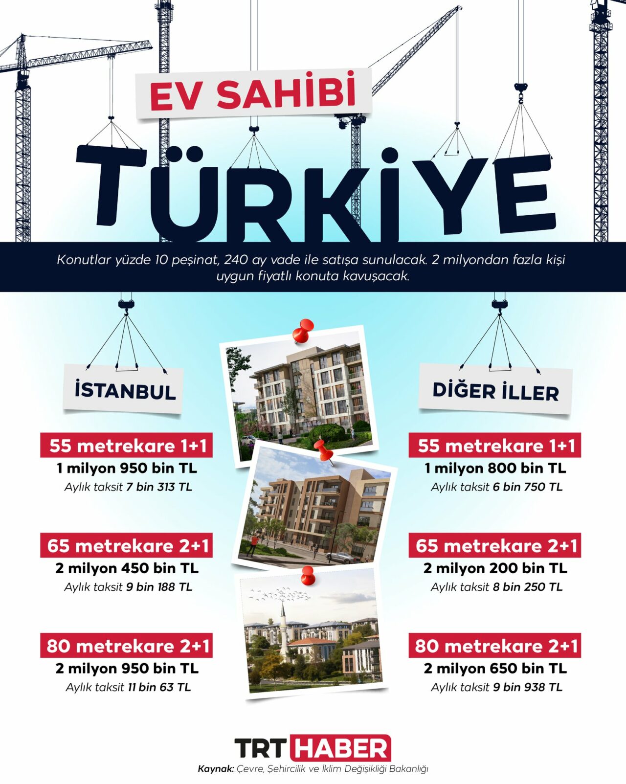 Düşük taksitlerle uzun vadede ödenecek konutların maliyeti 1.8 milyon liradan başlayacak. Yani, 180 bin TL peşinat ile kampanyaya 18 yaşını doldurmuş, tapuda eşi, kendisi ve çocukları üzerine kaydı bulunmayan Türk vatandaşı herkes başvurabilecek. İlk konutlar ise Mart 2027’de tamamlanacak.