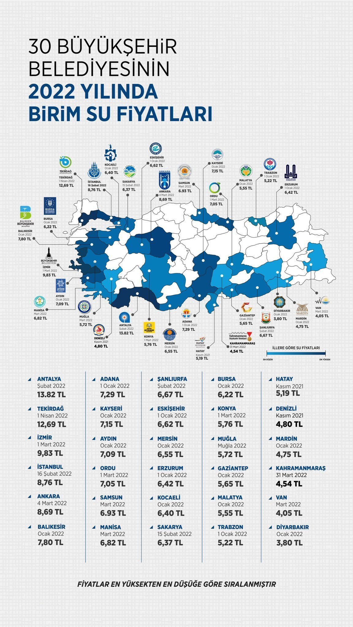 AK Partili Büyükşehir Belediyesi’nin yönetimindeki Bursa Su ve Kanalizasyon İdaresi (BUSKİ) Genel Müdürlüğü’nün Ocak 2022’deki 1 metreküp su fiyatı 6.22 lira ile 19. sırada görünüyor. Listede başı metreküp fiyatı Şubat 2022’de 13.82 lira ile CHP’li Antalya Büyükşehir Belediyesi çekiyor.