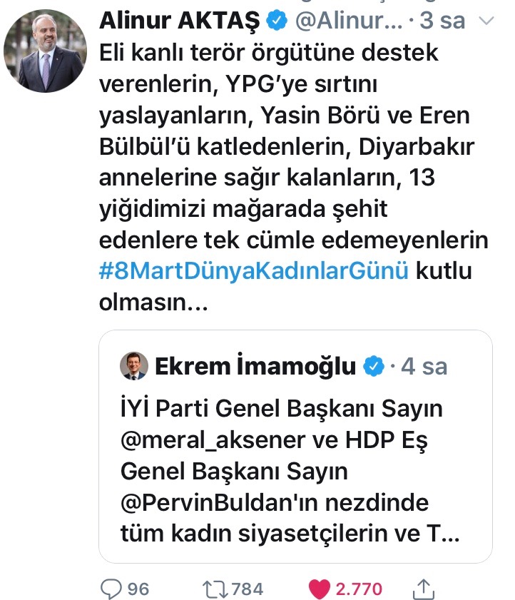 Aktaş mesajında, “Eli kanlı terör örgütüne destek verenlerin, YPG’ye sırtını yaslayanların, Yasin Börü ve Eren Bülbül’ü katledenlerin, Diyarbakır annelerine sağır kalanların, 13 yiğidimizi mağarada şehit edenlere tek cümle edemeyenlerin 8 Mart Dünya Kadınlar Günü kutlu olmasın” satırlarını yer verdi.