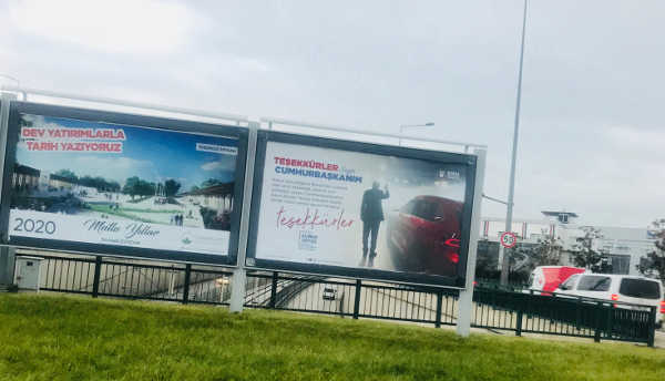 Büyükşehir Belediyesi ve AK Parti Bursa İl Başkanlığı kentin bilboardlarını, kavşaklarını, diğer reklam mecralarını Erdoğan’a teşekkür metinleriyle doldurdu.