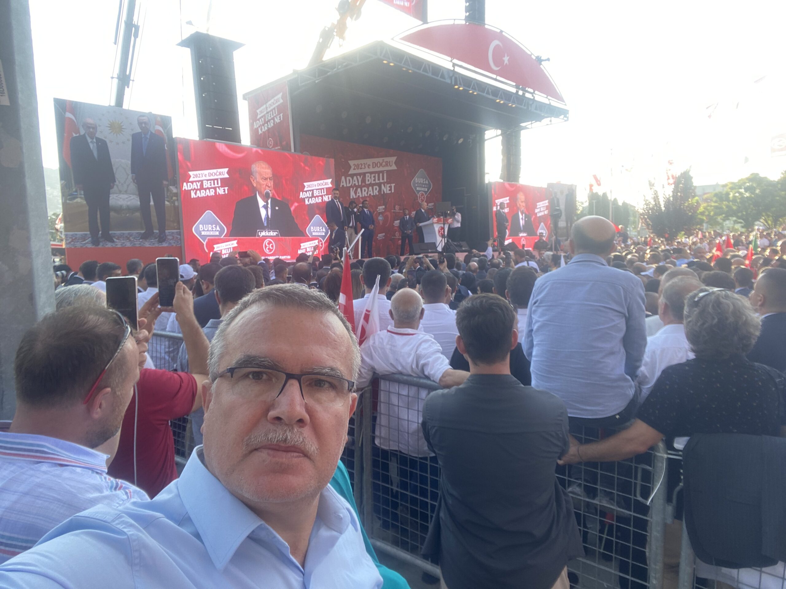 MHP’nin Sivas sonrası Bursa‘daki Gökdere mitinginde Cumhur İttifakı’nın ortağı AK Parti’den de tanıdık isimler gözümüze ilişti. İlçe belediye başkanları, ilçe yöneticileri MHP lideri Bahçeli’yi en ön safta izlediler. Meydanda Cumhurbaşkanı Erdoğan’ı aratmayacak güvenlik tedbirleri alınmış. Alandaki gazetecilerin bulunduğu bölgeye geçmek için Gökdere’yi adeta bir tur attık. MHP İl Teşkilatı alanı iyi süslemiş. Her yer de MHP ve Bahçeli flamaları asılıydı.