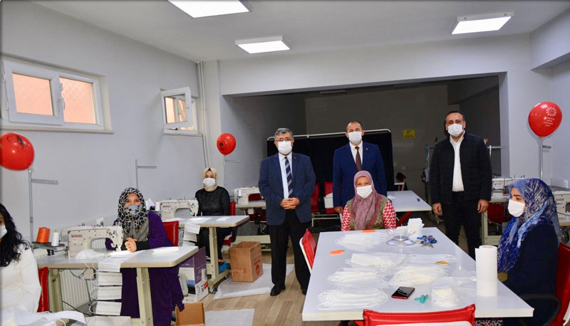 Kaymakam Emir Osman Bulgurlu ile Belediye Başkanı Ali Aykurt İlçe Halk Eğitim Merkezi’ni ziyarete ederek burada maske üretimini incelediler.