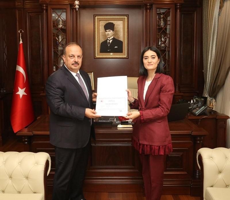 Keles’in ilk kadın kaymakamı için ilçede bir de veda yemeği düzenlendi. Kaymakam Teymur, ilçe esnafını da tek tek gezerek vedalaştı. Teymur ayrıca Vali Yakup Canbolat’a da veda ziyaretinde bulunup teşekkür etti. Vali Canbolat’ın Teymur’a başarı belgesi verdiğini görüyoruz.