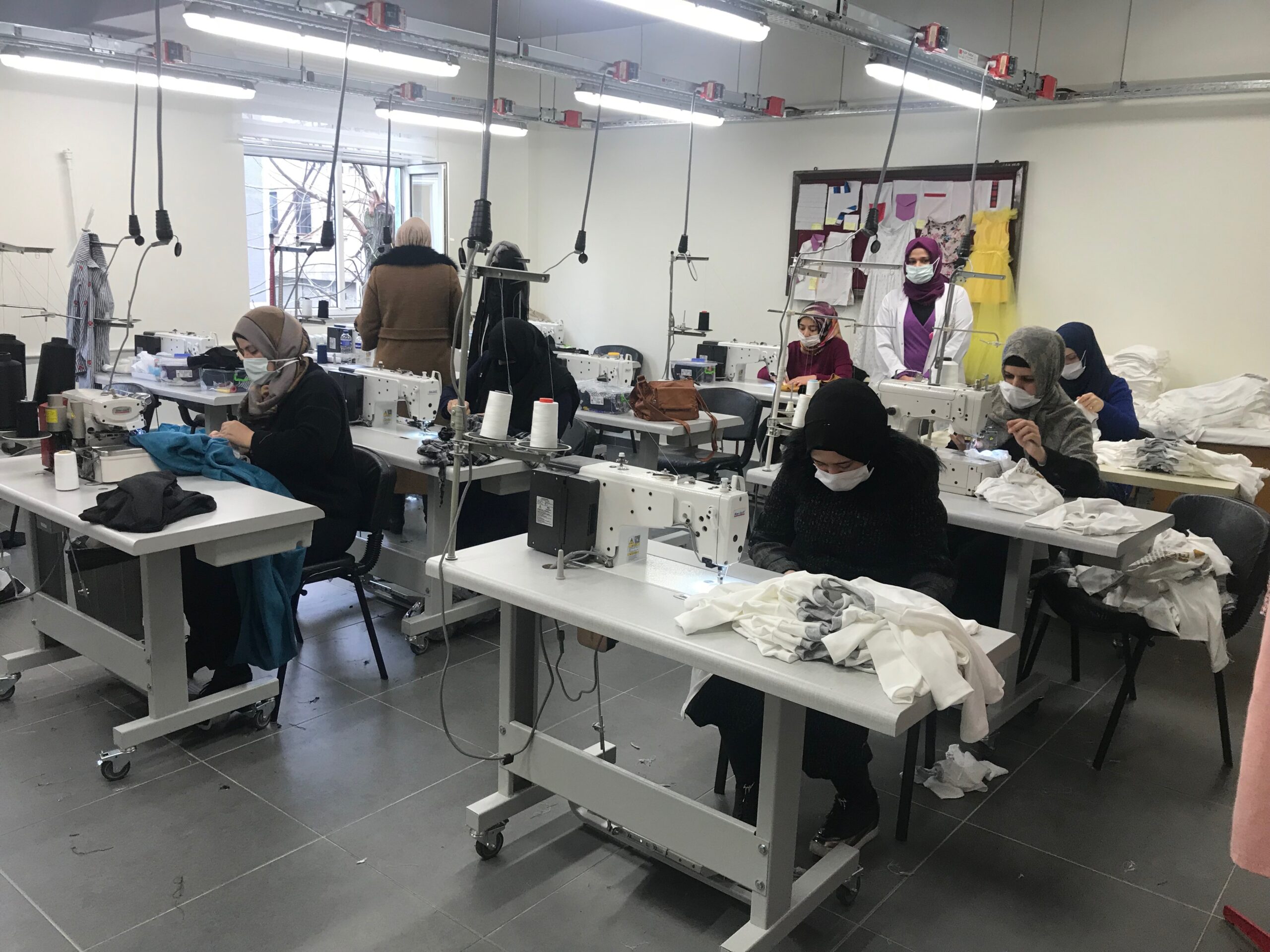 Üst katta ise Suriyeli Mültecilere dönük tekstil atölyeleri oluşturulmuş. Burada fason bebe konfeksiyonu üretiliyor. Hemen karşısındaki başka bir sınıfta eldiven dikim atölyesinde kursiyerler var. Burada 3,5 ay boyunca eğitim alacaklara iş garantisi veriliyor.