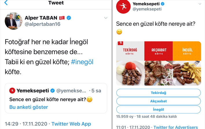 Şirketin ‘Sence en güzel köfte nereye ait’ sorusuna İnegöl Belediye Başkanı Alper Taban, ‘Fotoğraf her ne kadar İnegöl köftesine benzemese de tabii ki, en güzel köfte İnegöl köfte’ yanıtını verdi.