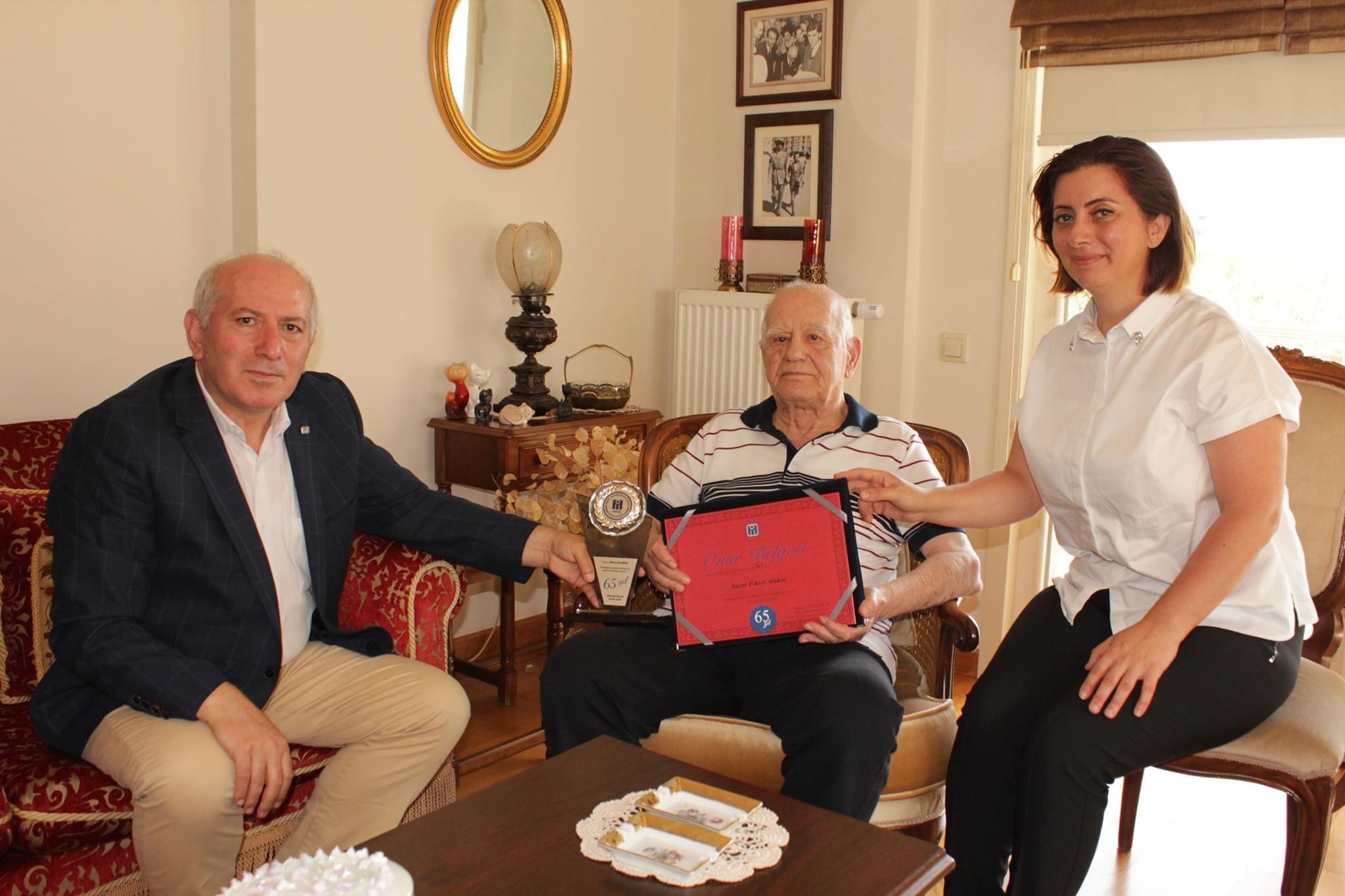 Başkan Albayrak, “Meslek büyüğümüz Fikret Alakoç’u ziyaret ederek 65. onur yılı plaketini teslim ettik. Hoş sohbeti ve güler yüzüyle bizleri ağırlayan meslektaşımıza ve ailesine teşekkür ederiz” dedi.