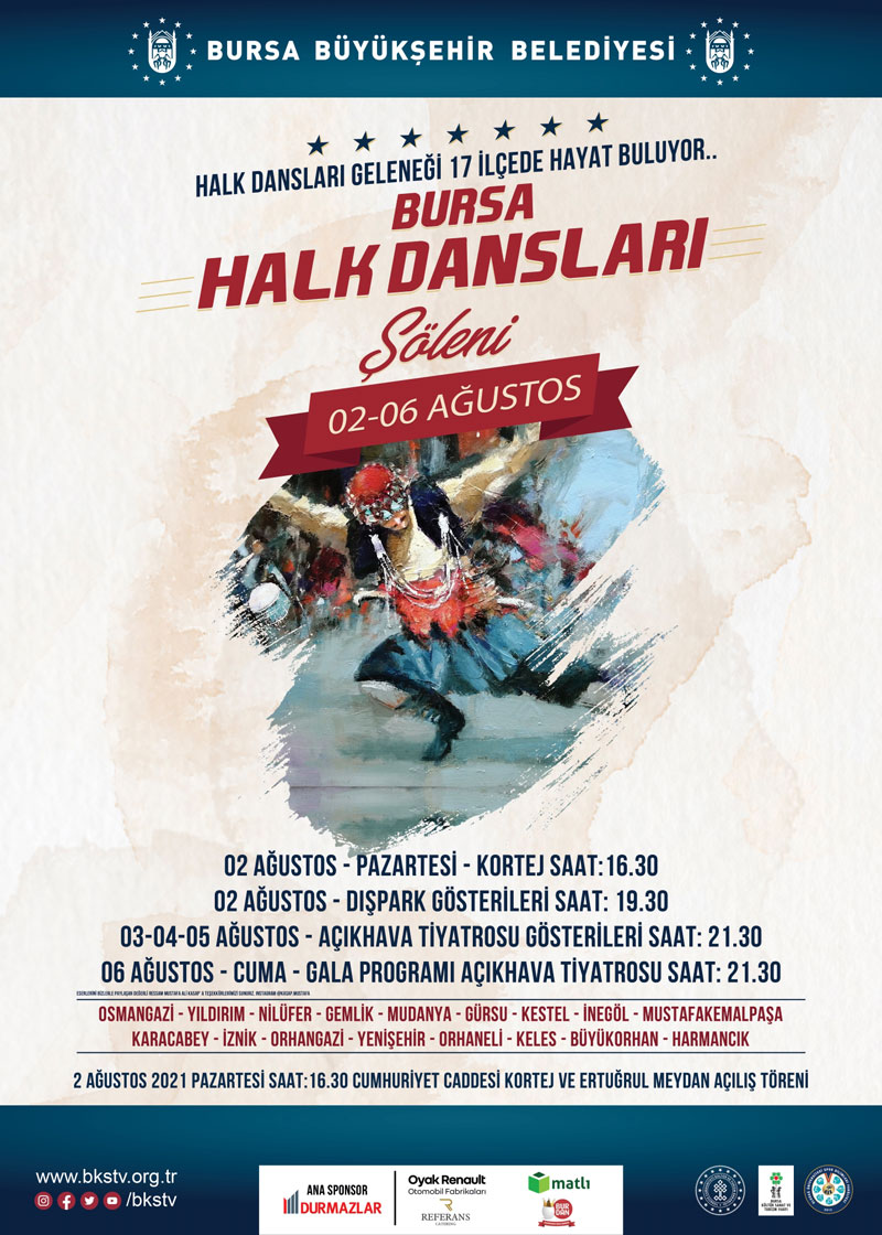 Büyükşehir Belediyesi’nin Bursa Kültür Sanat ve Turizm Vakfı’nın organizasyonunda gerçekleştireceği Halk Dansları Şöleni 2 Ağustos Pazartesi saat 16.30’da Cumhuriyet Caddesi’ndeki kortej ile başlıyor. Şenlik 6 Ağustos’a kadar sürecek. Final gösterileri ise Kültürpark Açık Hava Tiyatrosu’nda gerçekleşecek.