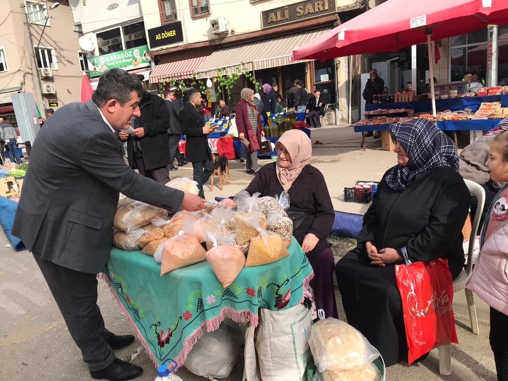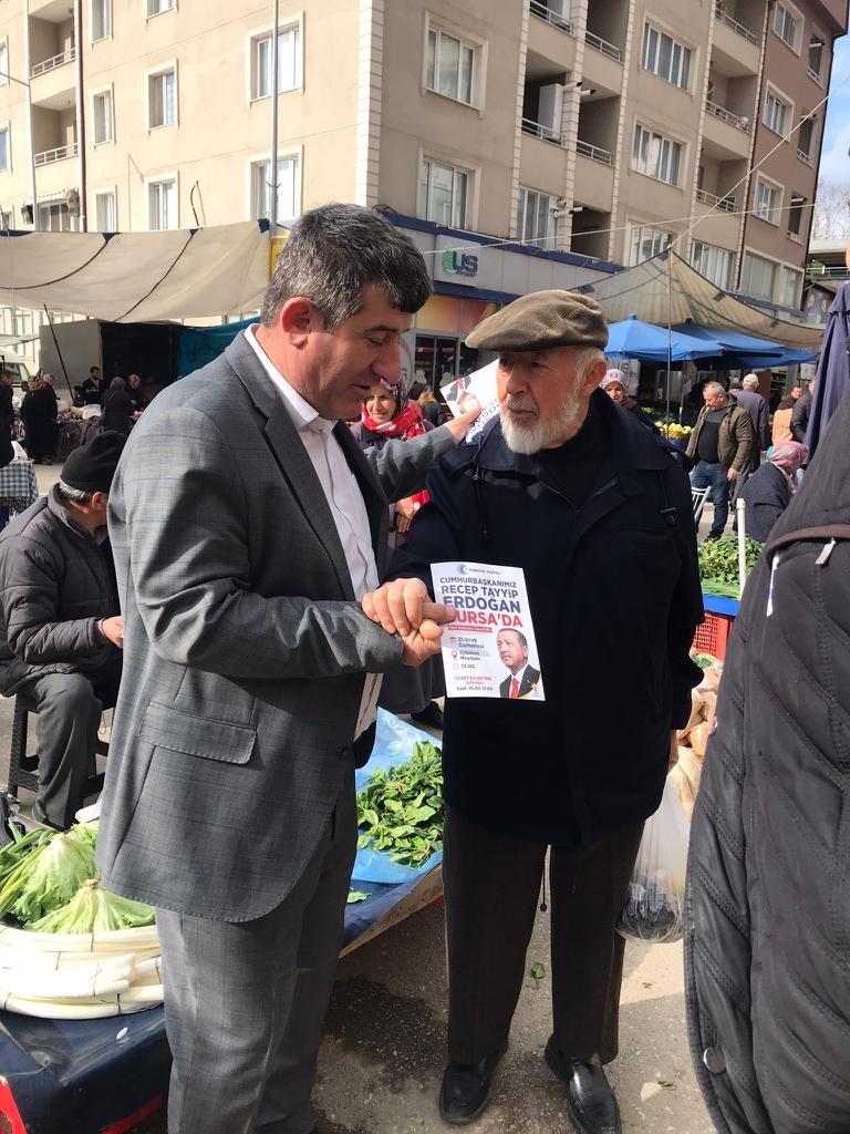 Dün sosyal medyada dikkatimizi çekti. AK Parti Orhaneli İlçe Başkanı Ramazan Turhan, ilçenin meşhur Beyce Pazarı’na çıkarak hemşerilerini Cumhurbaşkanı Erdoğan’ın cumartesi günü Gökdere Meydanı’ndaki mitinge davet etti. Teşkilat mensubu arkadaşlarıyla birlikte tek tek işyerlerini ve pazar tezgahlarını dolaşan Turhan, broşür verdiği hemşerilerini Bursa’daki mitingi izlemeye çağırdı.
