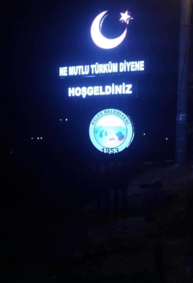 Keles Belediye Başkanı Mehmet Keskin ilçe girişine astırdığı mesaj yüklü tabelayla Türklük vurgusu yapmış.