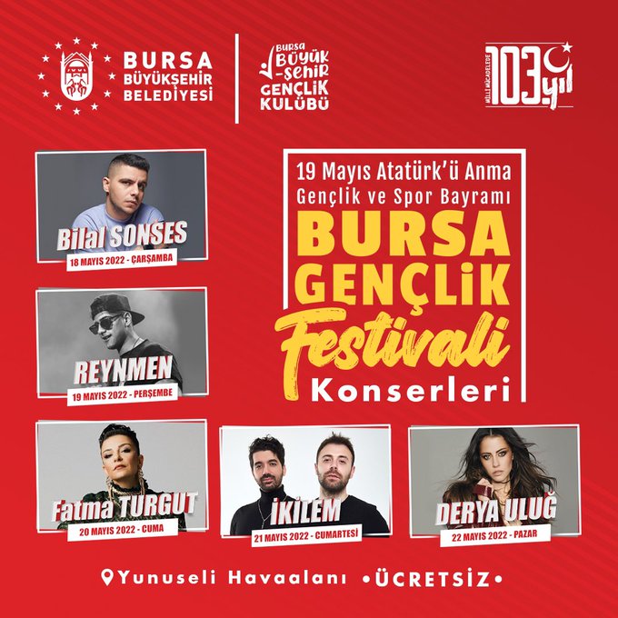 19 Mayıs için hazırlıkların sürdüren Büyükşehir Belediyesi’nin 18 Mayıs’ta Bilal Sonses, 19 Mayıs’ta Reynmen, 20 Mayıs’ta Fatma Turgut, 21 Mayıs’ta İkilem ve 22 Mayıs’ta Derya Uluğ konserleri ile gençlere sürprize hazırlanıyor.