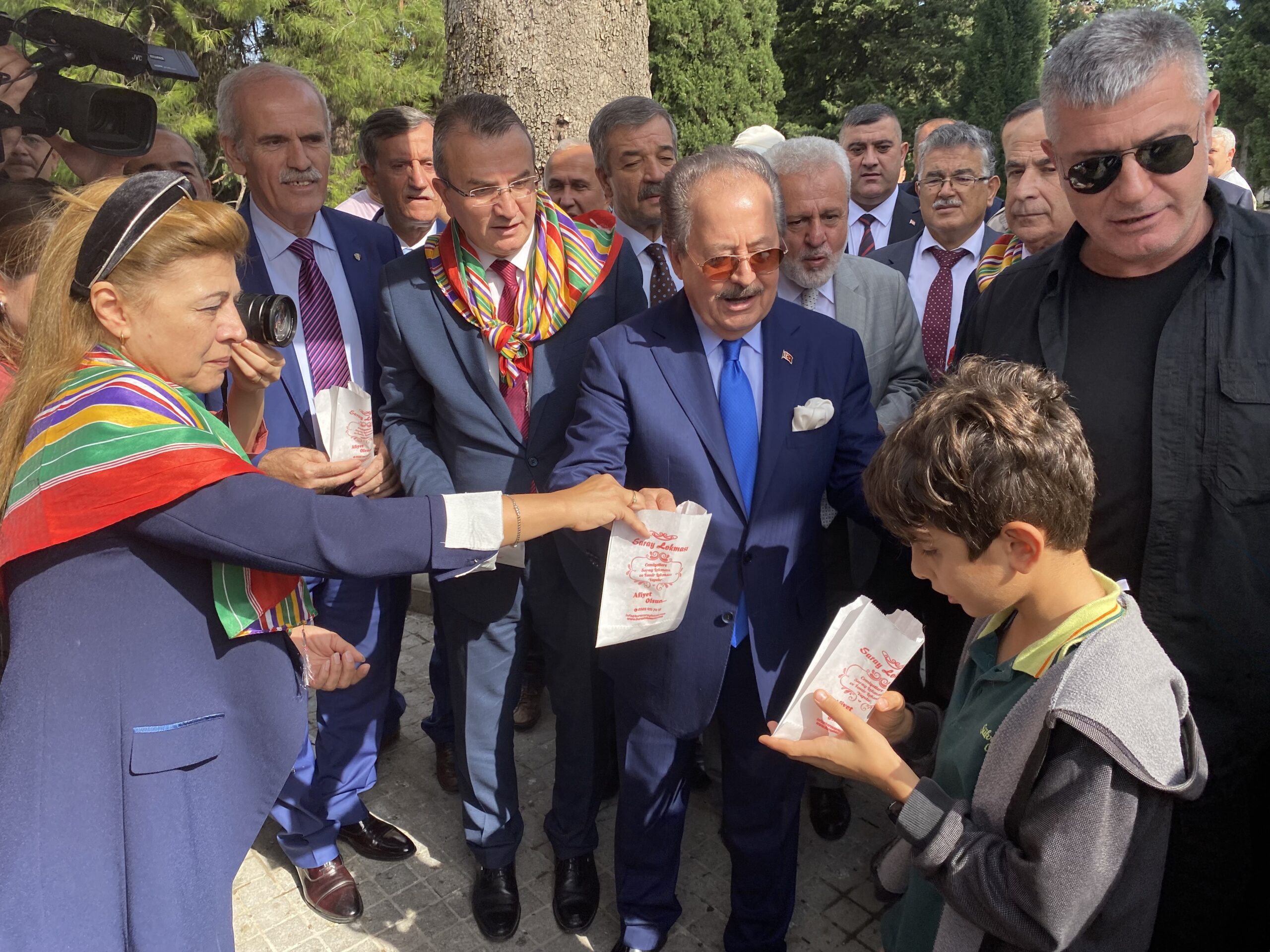 Bakan Çağlar, annesi merhum Hacer Çağlar’ın mezarı başında da dualar okudu, Ruhu için döktürülen lokmaları ziyaretçilere ve okul gezisi için Emir Sultan’da bulunan çocuklara ikram etti. Etrafında yine dostları, sevenleri vardı.
