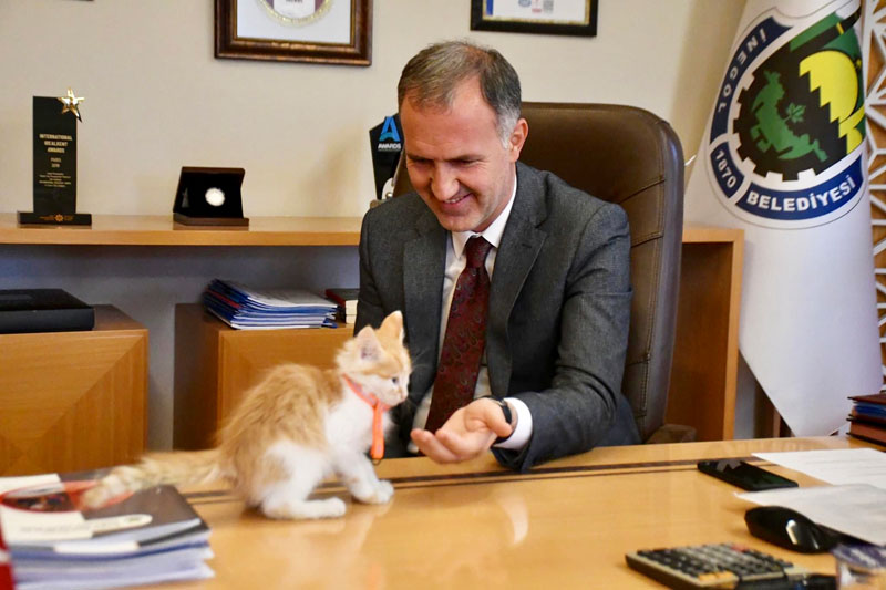 İnegöl Belediyesi minik bir kediyi sahiplenmiş. Başkan Alper Taban da makam masası üzerindeki kedi fotoğrafıyla sosyal medyadan, “Bu kedimizi belediye olarak sahiplendik. Artık bizimle birlikte belediyemizde yaşayacak Ona hep birlikte isim verelim. İsim önerilerinizi yorum olarak bekliyorum” diye paylaştı.
