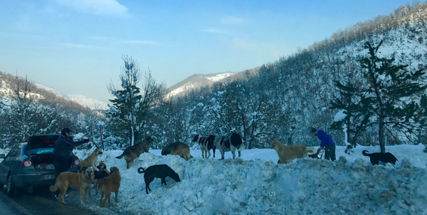 Doğancı Barajı yakınlarında aşırı kar yağışı yüzünden yiyecek bulmakta güçlük çeken sokak hayvanlarına parça et atan bir hemşehrimizi görünce umutlandık.