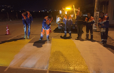 Önceki akşam evimize dönerken Büyükşehir Belediyesi Trafik Şube Müdürlüğü yol çizgi ekiplerinin yayaların sık geçtiği noktalardaki araç hızlarını kesici seddeleri boyadığını fark ettik.