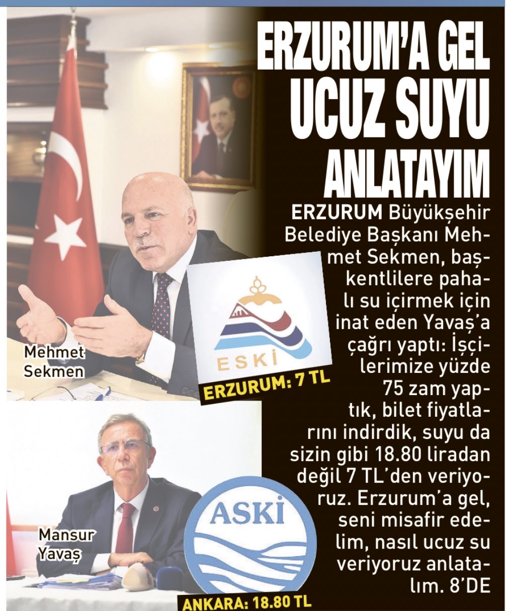 Başkentte bu tartışmalar sürerken AK Partili Erzurum Büyükşehir Belediye Başkanı Mehmet Sekmen CHP’li Mansur Yavaş’a, “Erzurum’a gel ucuz suyu anlatayım” çağrısı yapmış.