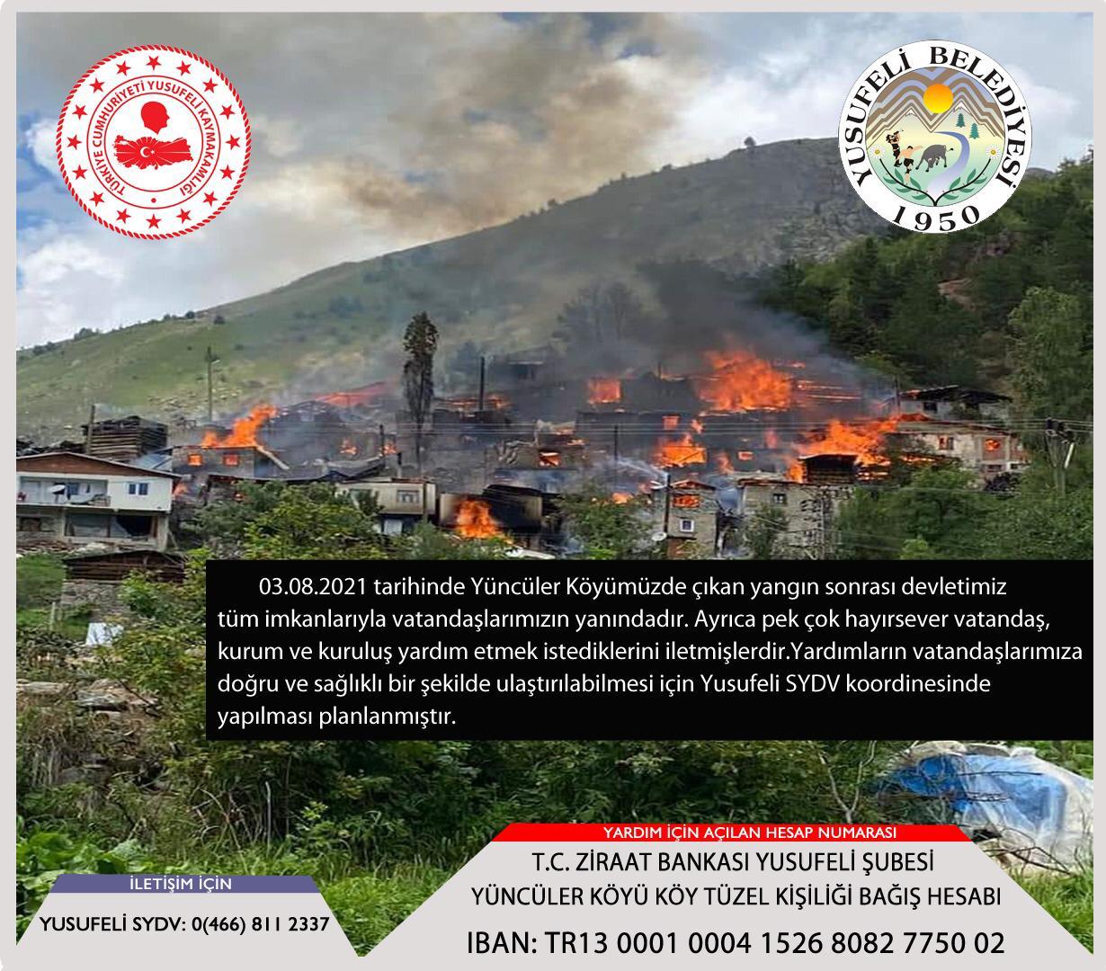 Yusufeli ilçesine bağlı Yüncü Köyü’nde, 3 Ağustos’ta çıkan yangın söndürülemeyince evlerin tümü kül oldu. Yusufeli Kaymakamlığı, yangından etkilenenlere yardım etmek isteyen yurttaşlarımız için tek elden bir yardım toplama kararı aldı.