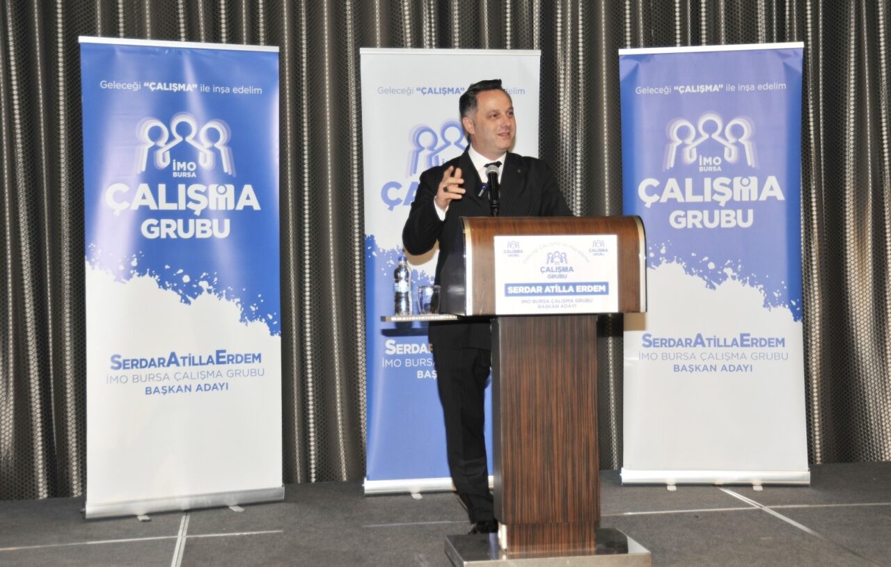 İMO Bursa Şube Başkanı Serdar Atilla Erdem Çalışma Grubu’nun adayı olarak yönetiminde yer alan isimleri hafta sonu Crowne Plaza Otel’de üyelerine tanıttı. Erdem, yarın da FSM Bulvarı üzerinde seçim aday irtibat ofisini açacak.