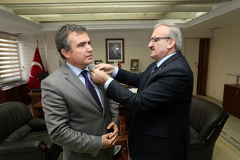 Vali Bey, çıkarken bizim de geçmişte eleştirdiğimiz lale figürlü Bursa logosunu yakamıza takmayı da unutmuyor.
