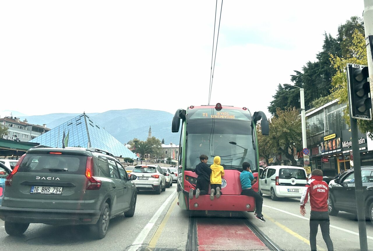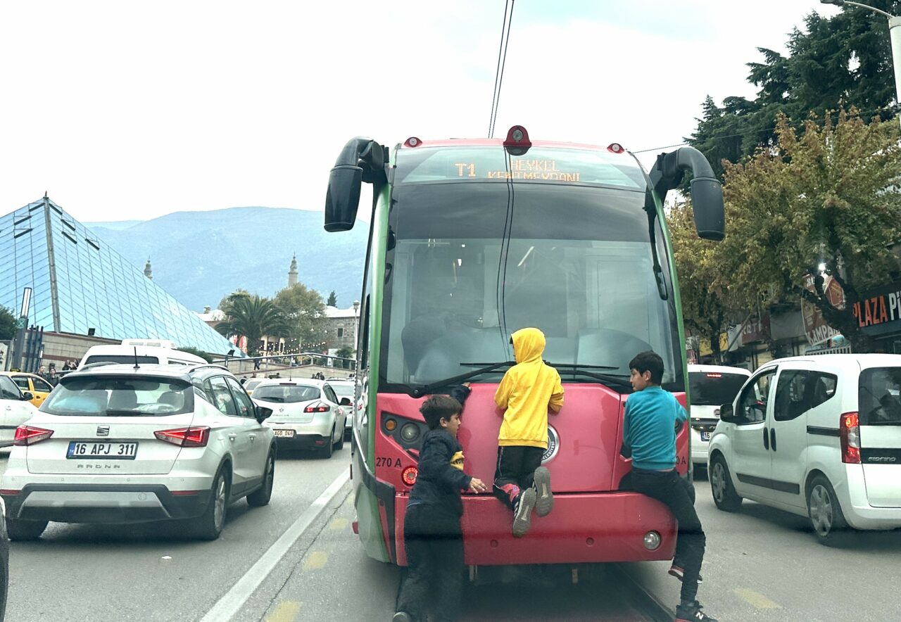 Önceki gün araçla seyir halindeyken fark ettik. Çocuklar Altıparmak yokuşunda İpekböceği katarının arka tramvayına tutunarak trafikte büyük bir tehlike oluşturdular.