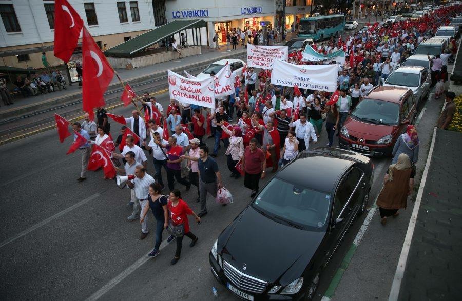 Önceki akşam Bursa Kamu Hastaneleri Birliği’ne bağlı sağlık çalışanları da Atatürk Caddesi‘nden başlayarak, İnönü ve Haşim İşcan‘dan Demokrasi Meydanı‘na kadar kalabalık bir grupla yürüdüler.