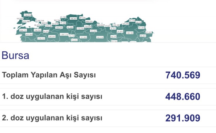 Bursa‘daki rakamlar henüz rahatladığımızı göstermiyor. 740 bini aşan toplam aşılanan sayısında iki dozu da alanlarımız 300 bini görmüş değil.