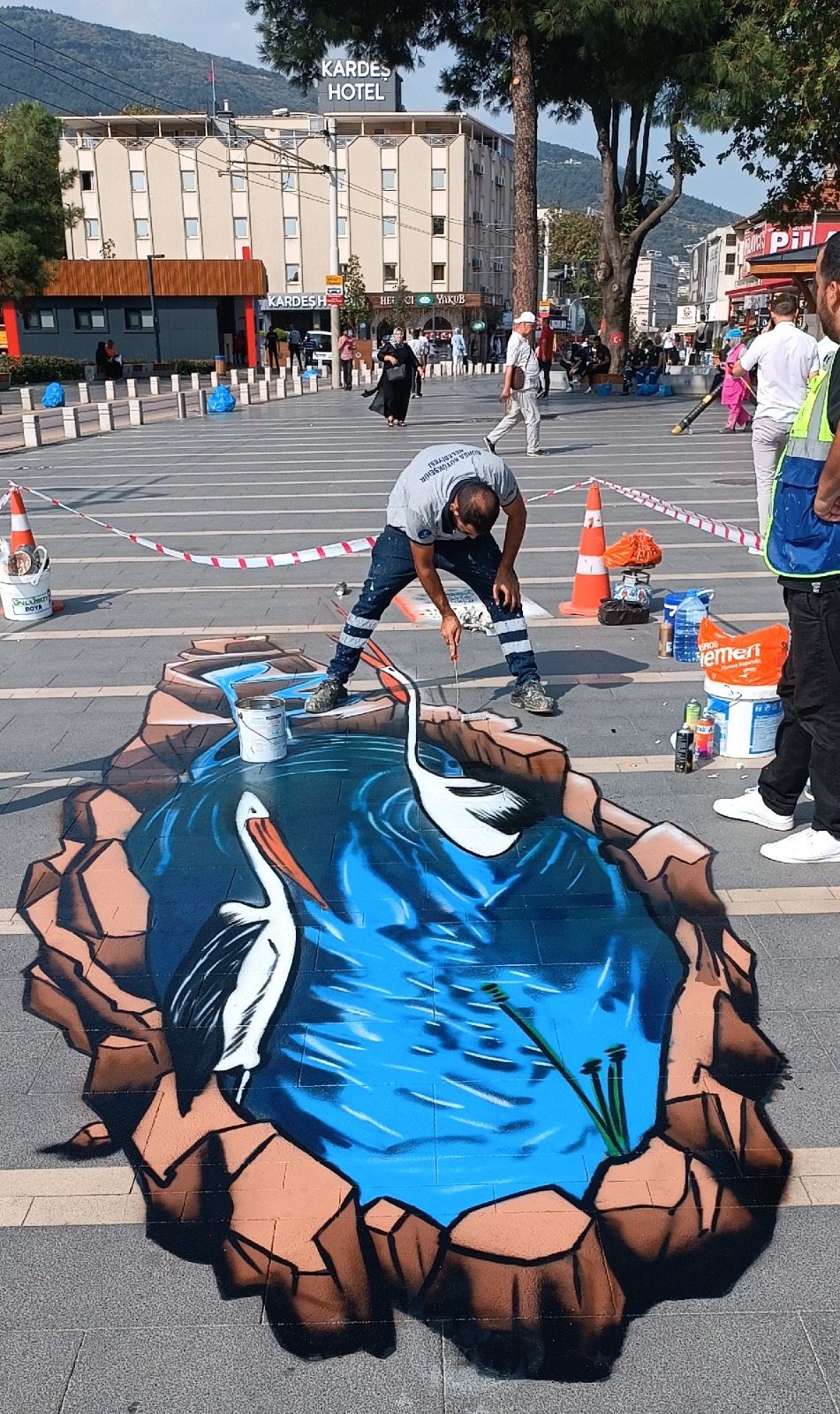 Bursa Büyükşehir Belediyesi Kent Estetiği Şube Müdürlüğü, meydan ve caddelere yeni bir hava katmak için 3D sokak boyama sanatıyla resimler çizmeye başlamış.
