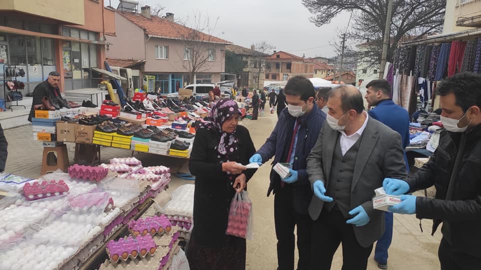 Harmancık Belediye Başkanı Yılmaz Ataş ilçe pazarına çıkarak hemşehrilerine ve pazarcı esnafına eldiven ile maske dağıtmış.