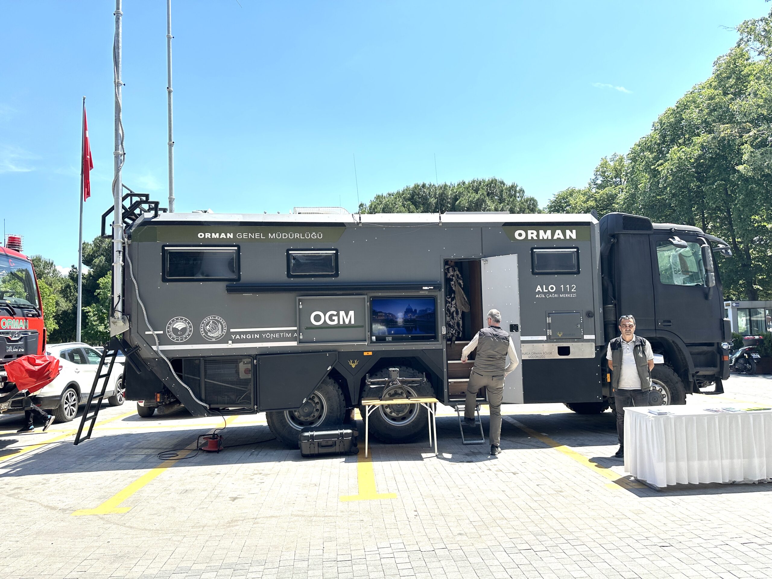 Dün Merinos Atatürk Kongre ve Kültür Merkezi önünde sergilenen mobil bir kriz merkezi dikkatimizi çekti. Uydu haberleşmeli yürüyen kriz merkezi, söndürme anında havadaki uçak ve helikopterlerle ve bölgedeki tüm ekiplerle irtibatlı çalışıyor.
