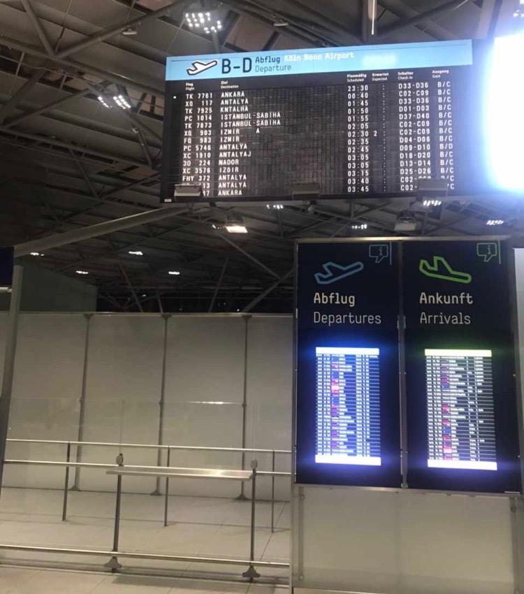 Köln Bonn Havalimanı’ndan kalkan uçakların rotasının neredeyse tümü Türkiye’yi gösteriyor.