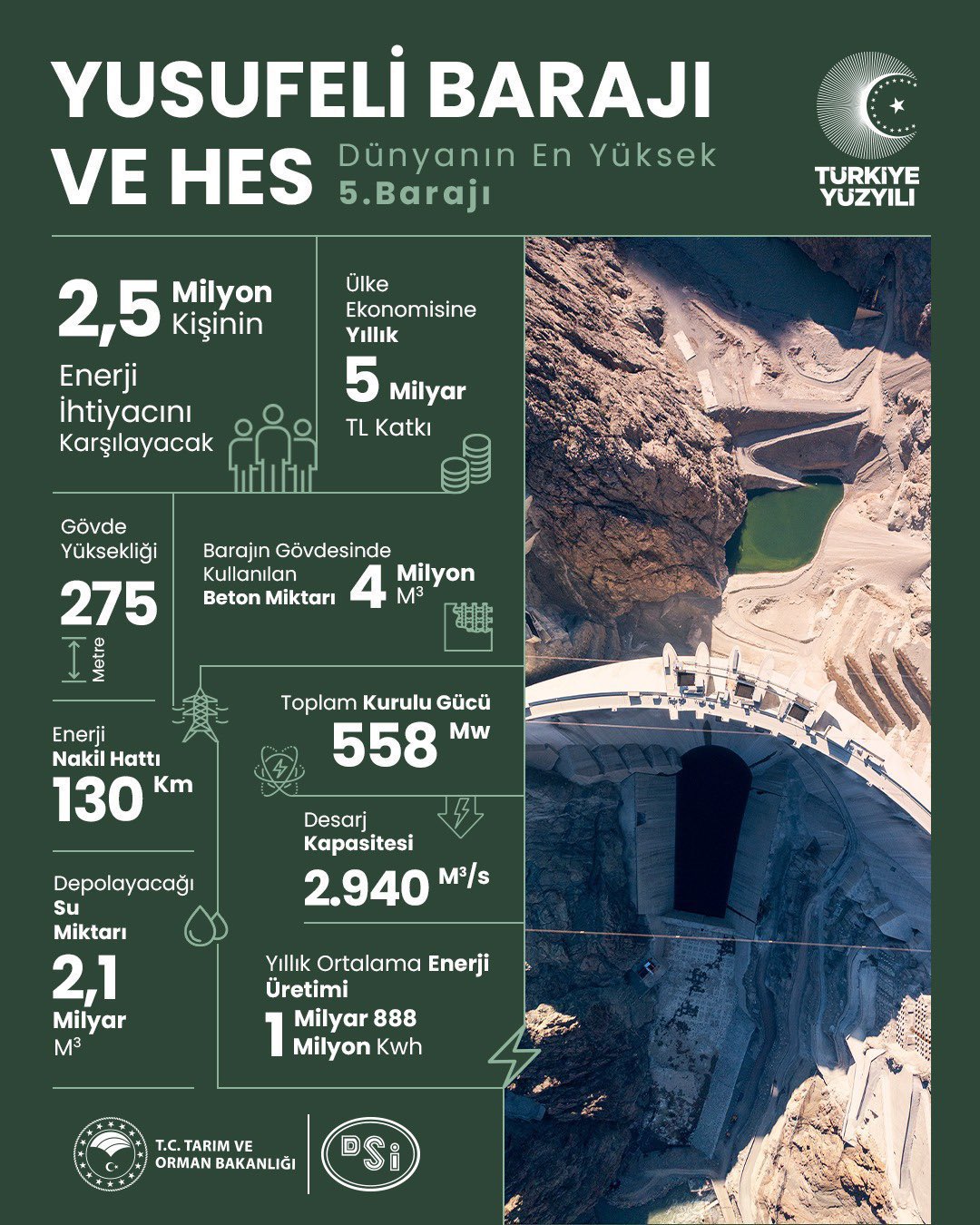 Dün Yusufeli Hidroelektrik Santrali hizmete girdi. Cumhurbaşkanı Recep Tayyip Erdoğan’ın katıldığı törenle kapakları kapatılan ve su tutmaya başlayan Yusufeli Barajı Türkiye’nin en büyük, dünyanın ise 5. büyük barajı olarak tarihe geçti.