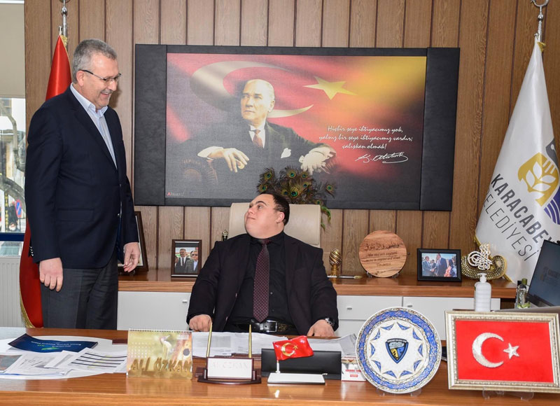 Karacabey Belediye Başkanı Ali Özkan ilçedeki hemşerisi Şaban’ı koltuğuna oturtup, sosyal medya hesabından,‘Bugün Başkan Şaban’ diye paylaştı.