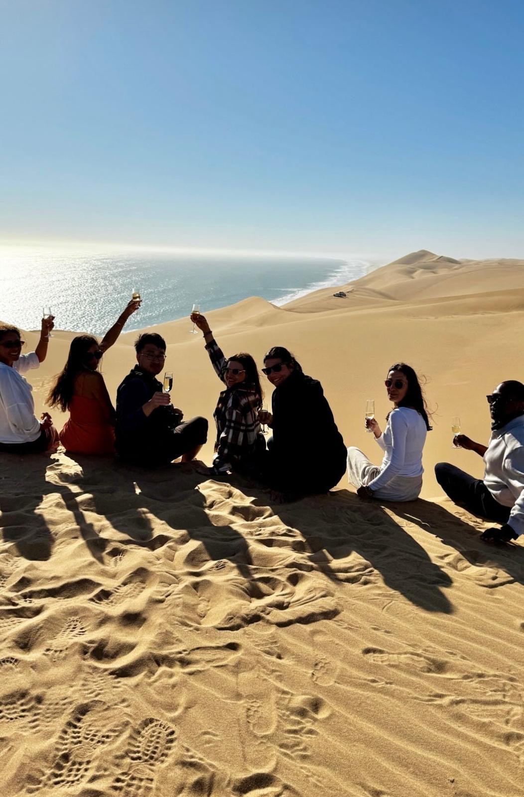 “Size katılıyorum. Namibya’da sabah yaptığımız balon turunu ve gittiğimiz Big Daddy Kumulu’nu unutamam. Big Daddy Kumulu oradaki en yüksek kumul. Kumulun tepesine çıkmak hiç kolay olmadı. Kuma bata çıka yürümek ve sürekli tırmanmak bayağı zorlayıcıydı. Big Daddy’nin tepesine çıktıktan sonra neredeyse kırk beş derecelik açıyla aşağı inmeye başlıyorsunuz. Ayaklarımız kuma batıp çıkarken hızlıca aşağı inmek, kumula tırmanabilmenin ödülü gibiydi, çok eğlenceliydi. Sandwich Harbour da Atlantik Okyanusu’yla büyük kumulların buluştuğu etkileyici bir yerdi. Orada da jiplerle safari yaptık. İki araçtık, herkes bağıra çağıra, kahkalarla, bazen korkarak kum tepelerine tırmanıp iniyorduk. Okyanusun kumullarla yanyana görüntüsü rüya gibi manzaralar yaratıyordu. Kumulların tepesinde yürüdük, birlikte aşağı koşarak indik. Hepsi unutulmaz deneyimlerdi.”