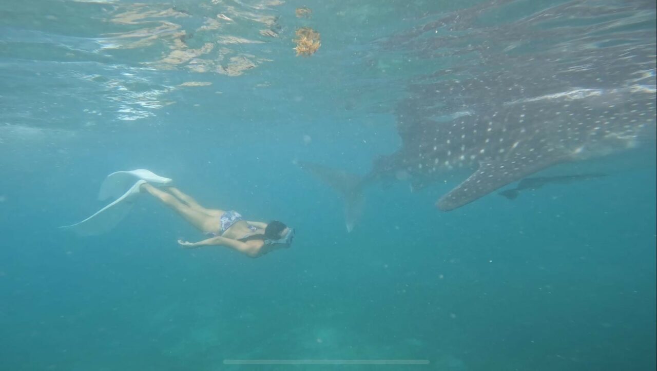 “Daldığım yer okyanus değildi, adalar arasında Bohol Denizi var, orada daldım, tüpsüz dalışla sardalya sürüleri ve deniz kaplumbağalarıyla yüzdük, çok güzeldi. Sonra Oslob’da balina köpekbalıklarıyla yüzmeye gittik.”