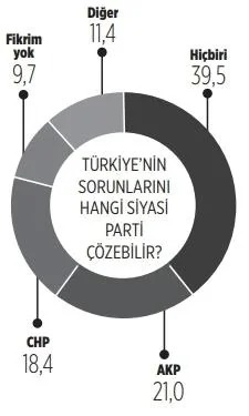 Asal Araştırma’nın son anketinde “Türkiye’nin sorunlarını hangi siyasi parti çözer?” sorusuna verilen yanıtlar bunu gösteriyor. Ankete göre ülke sorunlarını hiçbir partinin çözemeyeceğini düşünenlerin oranı yüzde 40’a yaklaştı. Soruya AKP çözer diyenlerin oranı yüzde 21. Yerel seçimlerde büyük bir sıçrama yapan CHP’nin, “yumuşama – normalleşme” söylemi pek işe yaramamış. Toparladığı oyları hızla yitirdiği anlaşılıyor. Aynı soruya CHP çözer diyenlerin oranı 18.4, diğer diyenlerin ise 11.4, fikrim yok diyenler ise 9.7.