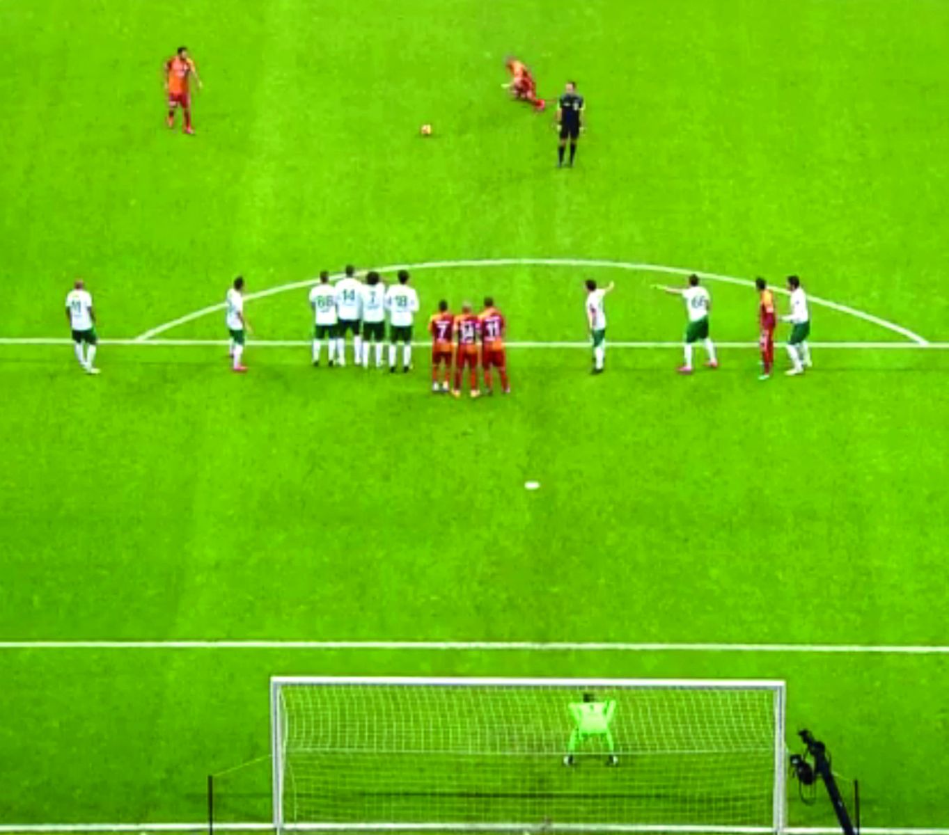 Sneijder’in frikik vuruşundan önce şeklen ofsayt konumunda bulunan 3 kişilik blok-barajı hakemin ikaz etmesi gerekiyordu ama bırakın ikaz etmeyi Barış Şimşek ve yardımcıları olayın farkında bile değildi…