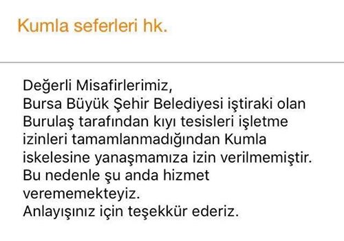 Değerli misafirlerimiz, Bursa Büyükşehir Belediyesi iştiraki olan Burulaş tarafından kıyı tesisleri işletme izinleri tamamlanmadığından Kumla İskelesi’ne yanaşmamıza izin verilememiştir. Bu nedenle şu anda hizmet vermemekteyiz. Anlayışınız için teşekkür ederiz