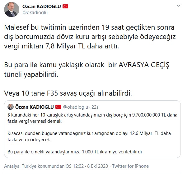 “Maalesef bu twitimin üzerinden 19 saat geçtikten sonra, dış borcumuzda döviz kuru artışı nedeniyle ödeyeceğimiz vergi miktarı 7,8 Milyar TL daha arttı. Bu para ile kamu yaklaşık olarak bir Avrasya Geçiş Tüneli yapabilirdi. Veya 10 tane F 35 savaş uçağı alınabilirdi.”