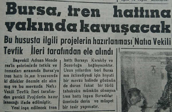 Başvekil Adnan Menderes’in şehrimizde tetkik ve temasları sırasında Bursa’ya tren hattı inşası hususundaki dilekler önemle ele alınmış ve bu mevzuda Nafia Vekili Tevfik İleri tarafından gerekli projelerin hazırlanacağı ifade edilmiştir. Yeni inşa edilecek tren hattı Bursa’yı Karaköy ve Susurluk’a bağlayacaktır. Uzun yıllardan beri Bursa’nın iktisadiyadi için hayati bir mevzu halinde gözönünde duran fakat bir türlü tahakkuku mümkün olmayan tren hattı inşası Bursalılar üzerinde derin ve müspet bir tesir yapmıştır.