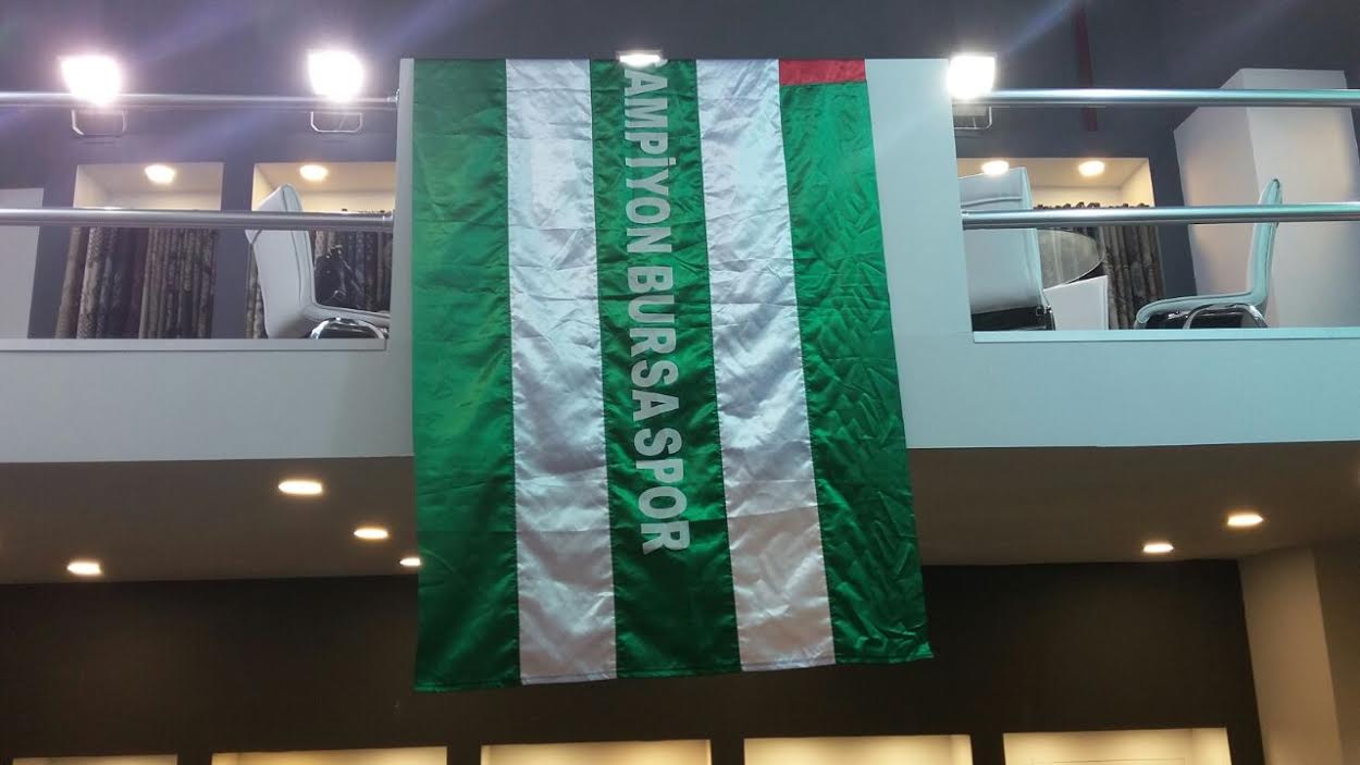 Fenerbahçe zaferinden sonra, Bursaspor bayrakları, kaşkol ve flamaları, fuar stantlarını süslemiş.