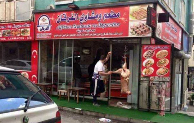 İşyerinin önüne et parçalayan Suriyeli esnafın fotoğrafı onlarca kişi tarafından paylaşıldı ve sayısız tepki mesajları yağdı.