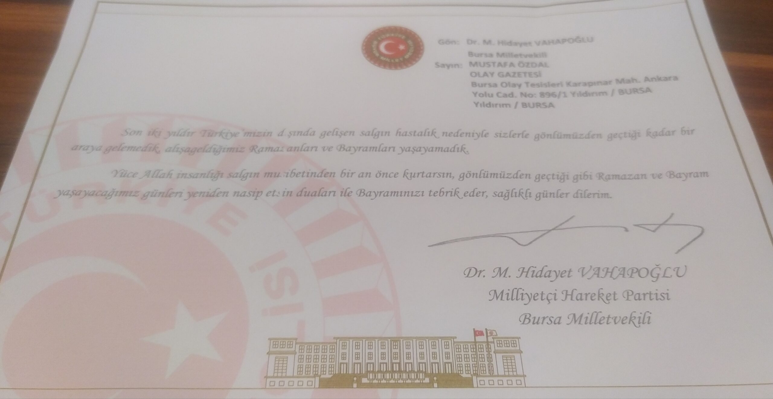 MHP Bursa Milletvekili Dr. Hidayet Vahapoğlu, sağolsun bayramımızı bir tebrik kartıyla kutlamış: