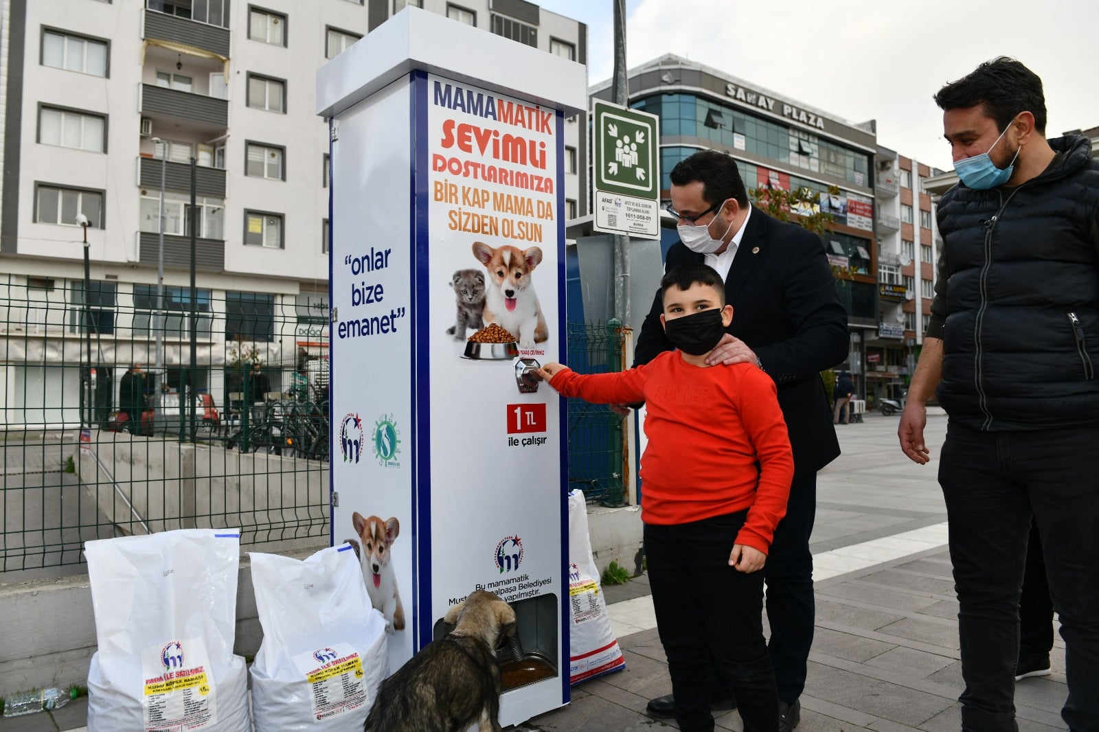 Kentin çeşitli noktalarına konulan mamamatiklere, 1 lira atıyorsunuz ve makineden anında mama dökülüyor, can dostlar afiyetle yesin diye.