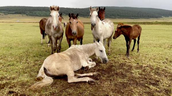 Yürüyemediği için bulunduğu yere yatan atın yanından sürüdeki diğer atlar hiç ayrılmıyor.