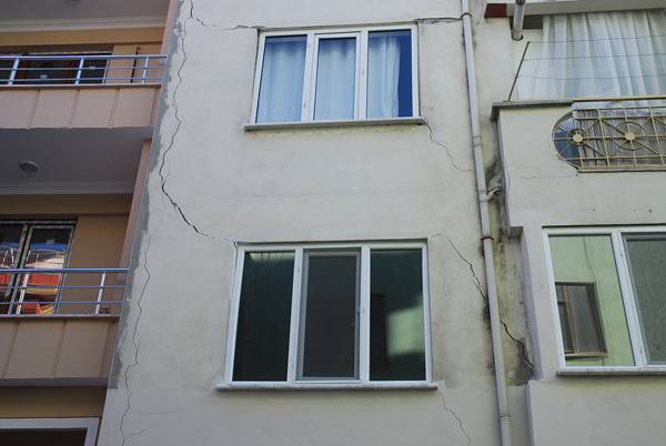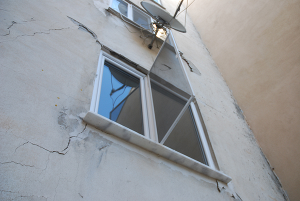 Fotoğratta da açık bir şekilde görüldüğü gibi, yeni binanın yaptığı baskı, eski binada çatlaklar oluşturmuş.