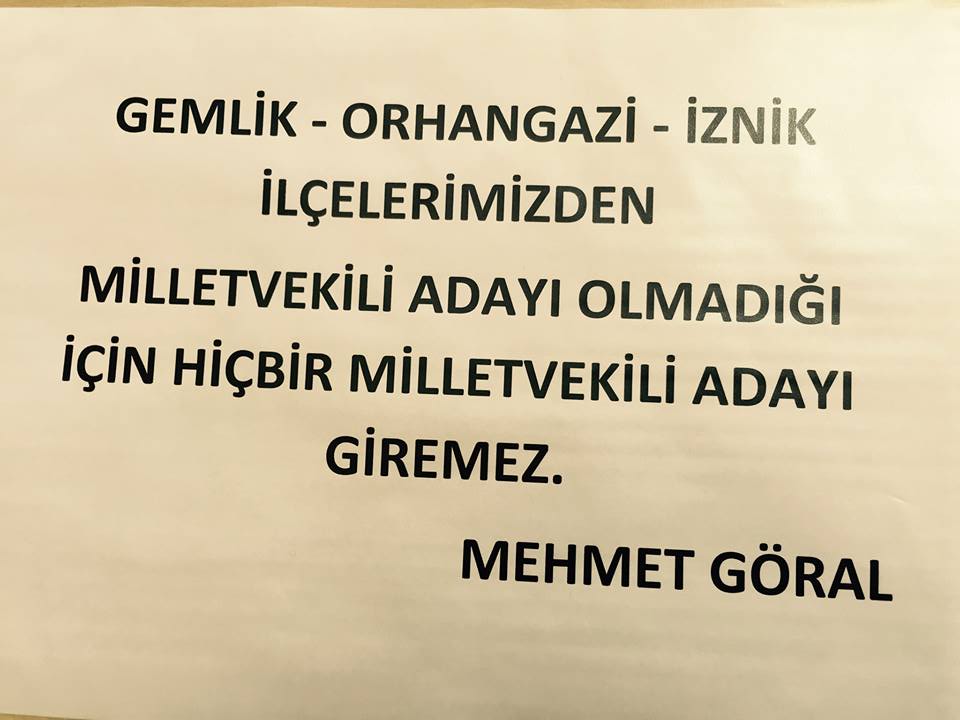 Gemlik‘in tanınmış esnaflarından Mehmet Göral, dükkanının camına, “Gemlik-Orhangazi-İznik ilçelerimizden, milletvekili adayı olmadığı için, hiçbir milletvekili adayı giremez” yazısını asmış.